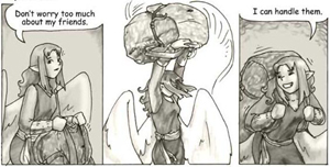 The first arc that introduces her reveals that she has been sorta stalking Marten and co. for several weeks. The rest of the cast have quite a few issues of their own, but Hannelore is quite definitively crazy. And Jeph Jacques manages to write her as realistically crazy, and that’s what impresses me so much.