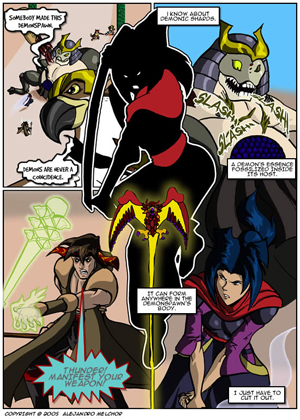 Now then, exactly what does that mean? For those not in the know, the d20 system is what is used as the rules basis for Dungeons and Dragons, as well as many other roleplaying games. From this, one might expect a comic like Commissioned (Fantasy RPG Arc) or Order of the Stick, with a plot in a fantasy world where you can clearly see the game mechanics functioning behind the scenes.