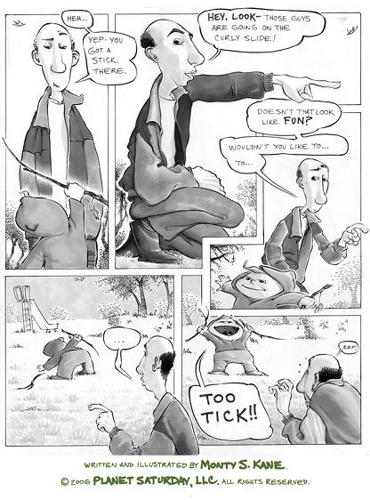 According to the site, Planet Saturday, by Monty S. Kane, is “a monthly comic about memory, imagination, and parenthood.” It is “GUARANTEED, in no particularly legally binding way, to amuse, educate, and enlighten; remove unsightly blemishes; grow hair on bald heads; and make you taller. The comics, in particular, will cut through a soup can- and still slice a tomato LIKE THIS!”