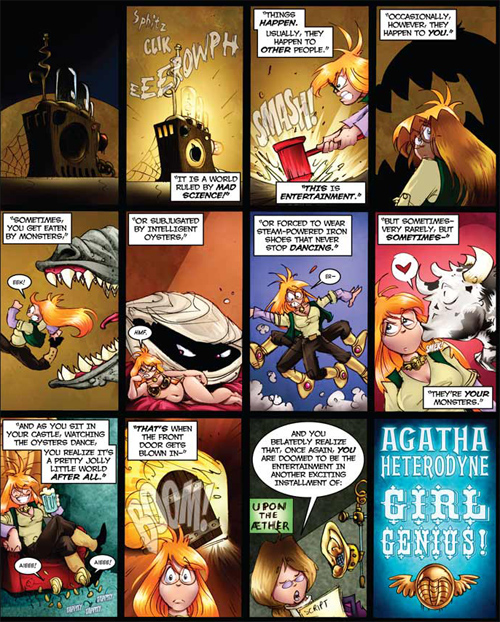 There are a lot of top-notch webcomics out there that are good inspirations for aspiring cartoonists, and that provide good examples of what to do and what not to do. But Girl Genius is easily one of a very small handful of strips I can point to and say: This, right here, is a comic done right.